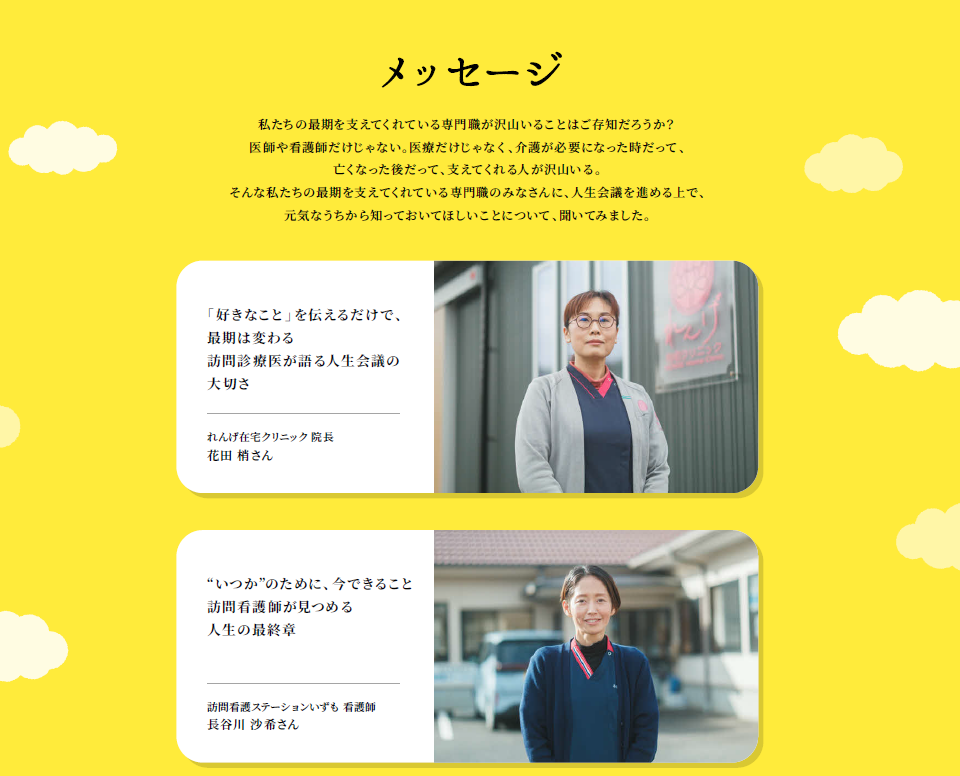 医師や看護師だけじゃなく、介護が必要になった時だって、亡くなった後だって、支えてくれる人が沢山います。