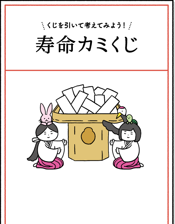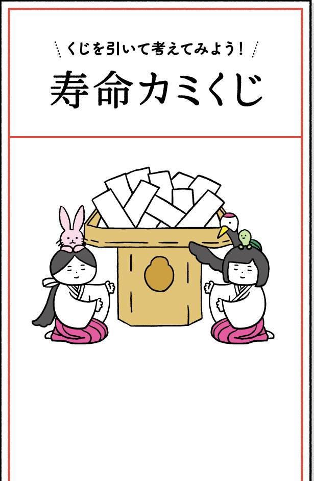 「いま」は元気だから、大丈夫。 でも突然、 「いざ」って時が訪れることもある。 「いざ」じゃなく「いま」 想いを伝え合う人生会議を。 2025.11.30 11月30日は「人生会議の日」です! 2025.11.25 『日刊ラズダ』さんに掲載していただきました! 2025.11.25 新コンテンツ『寿命カミくじ』が追加されました! 一覧はこちら 詳しく見る