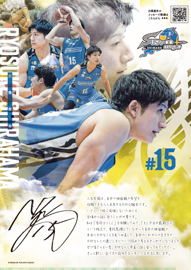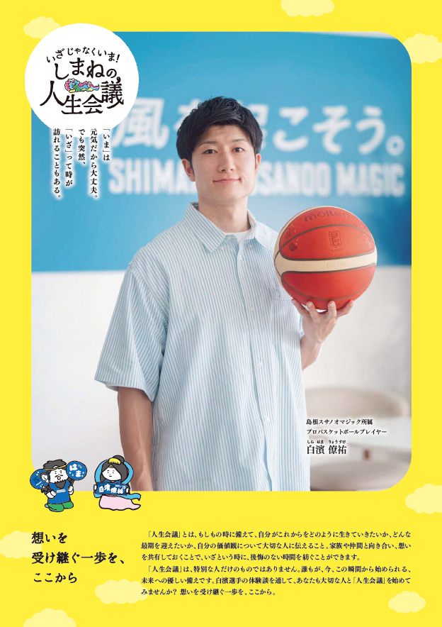 この度、島根スサノオマジック「白濱僚祐」選手の協力を得て、白濱選手への人生会議に関するインタビュー記事(リーフレット)と、特製クリアファイルを制作しました。